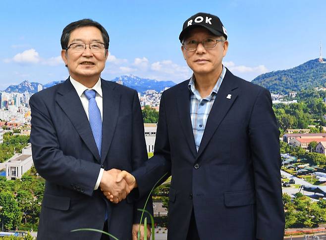 [서울=뉴시스] 추상철 기자 = 백승주(왼쪽) 전쟁기념사업회장과 이병균 한국잡월드 이사장이 지난 3일 서울 용산구 전쟁기념관에서 국방·안보 분야 직업 체험 콘텐츠 개발과 청소년 진로 프로그램 연계 방안 등에 대해 논의한 후 기념촬영을 하고 있다. (사진= 전쟁기념사업회 제공) 2025.07.06. photo@newsis.com *재판매 및 DB 금지