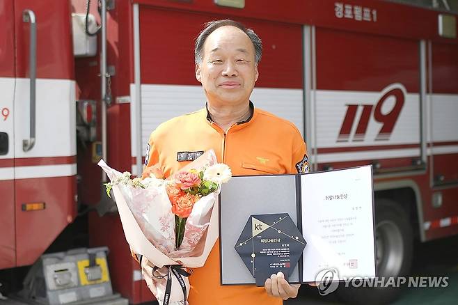 (서울=연합뉴스) KT그룹 희망나눔재단은 올해 두 번째 희망나눔인상에 공군 제15특수임무비행단과 김만하 소방관을 공동 선정했다고 6일 밝혔다. 사진은 KT희망나눔인상 공동 수상자인 강릉소방서 김만하 소방관. 2025.7.6 [KT 제공. 재판매 및 DB 금지]