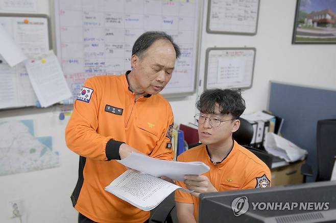 (서울=연합뉴스) KT그룹 희망나눔재단은 올해 두 번째 희망나눔인상에 공군 제15특수임무비행단과 김만하 소방관을 공동 선정했다고 6일 밝혔다. 사진은 KT희망나눔인상 공동 수상자인 강릉소방서 김만하 소방관(왼쪽)이 동료 직원과 이야기하는 모습. 2025.7.6 [KT 제공. 재판매 및 DB 금지]