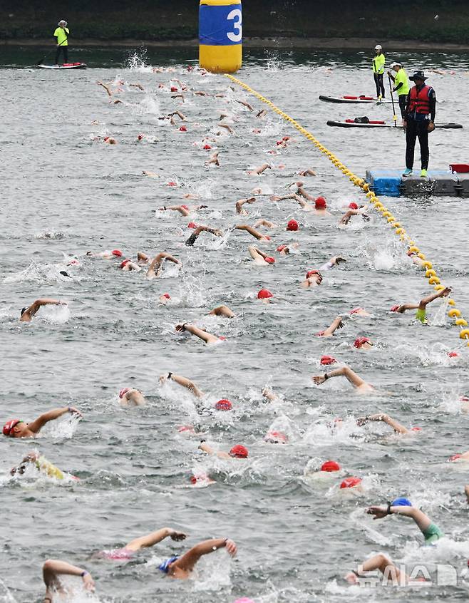 [서울=뉴시스] 김근수 기자 = 6일 오전 서울 송파구 롯데월드타워 일대에서 열린 '2025 롯데 아쿠아슬론'에서 참가자들이 수영을 하고 있다.