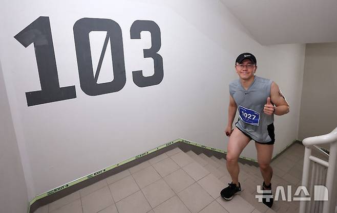 [서울=뉴시스] 김근수 기자 = 6일 오전 서울 송파구 롯데월드타워 일대에서 열린 '2025 롯데 아쿠아슬론'에서 참가자가 타워 계단을 오르고 있다.