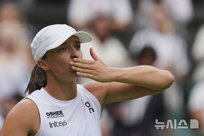 [런던=AP/뉴시스] 이가 시비옹테크(4위·폴란드)가 5일(현지 시간) 영국 런던 올잉글랜드 클럽에서 열린 2025 윔블던 테니스 대회 여자 단식 3회전에서 대니엘 콜린스(54위·미국)를 꺾고 손 키스를 날리고 있다. 시비옹테크가 2-0(6-2 6-3)으로 승리하고 16강에 올라 클라라 타우손(22위·덴마크)을 상대한다. 2025.07.06.