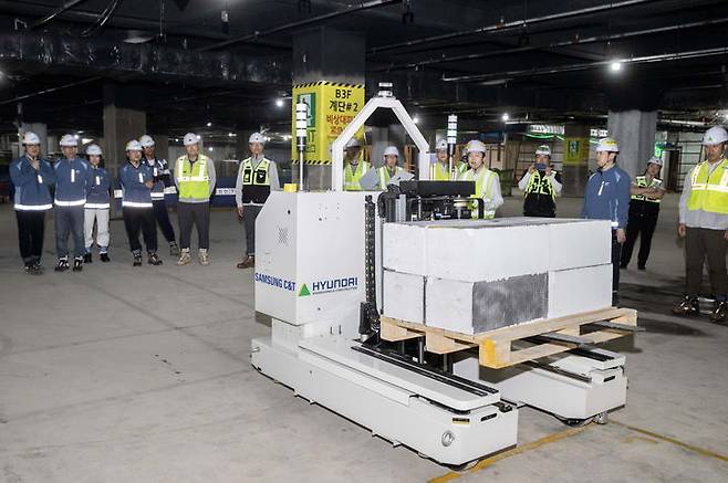 [서울=뉴시스] 홍세희 기자 = 삼성물산 건설부문과 현대건설은 지난 3일 인천 청라 하나드림타운에서 스마트 자재 운반 로봇 기술 시연회를 개최했다고 6일 밝혔다.