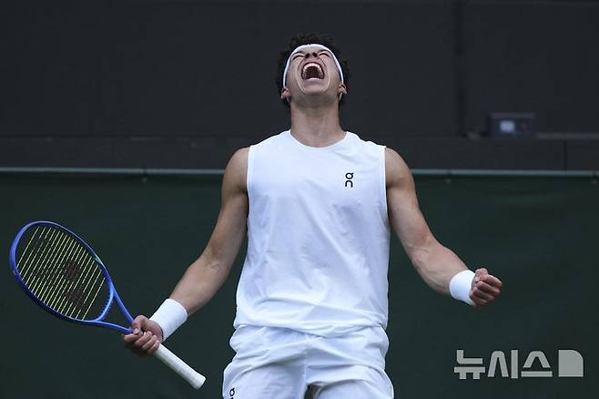 [런던=AP/뉴시스] 벤 셸턴(10위·미국)이 5일(현지 시간) 영국 런던 올잉글랜드 클럽에서 열린 2025 윔블던 테니스 대회 남자 단식 3회전에서 마르톤 푸초비치스(105위·헝가리)를 꺾은 후 포효하고 있다. 셸턴이 3-0(6-3 7-6 6-2)으로 승리하고 16강에 올랐다. 2025.07.06.