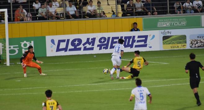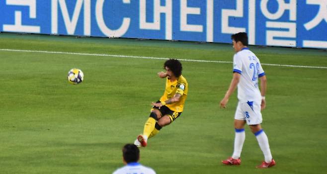 | ▲ 18분 48초, 전남 드래곤즈 MF 알베르띠의 감각적인 오른발 아웃사이드 슛이 들어가는 순간 |