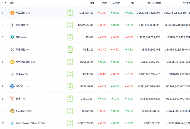 비트코인은 0.8% 상승하며 약 10만8천147달러에 거래 중이다. 도지코인은 0.2% 오르며 약 0.164달러를 나타냈다. 테더(USDT)와 USDC는 0.0%의 변동률을 기록하며 1달러 선을 그대로 유지했다.