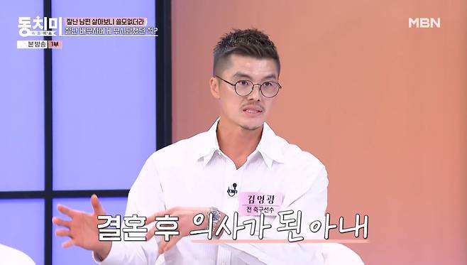 이날 전 축구선수 김영광은 '잘난 배우자에게 무시당했던 적이 있냐'는 질문에 "절대 무시를 했다고 생각은 안 하는데 은근히 무시한다. 와이프만 해도 괜찮은데 저희 딸들도 (은근히 무시하는 경향이) 있다. 와이프가 저와 결혼하고 나서 의사가 됐는데 그때 지식의 차이가 있다는 것을 알았다. 둘이 좋으면 되니까 만났다. 그 전까지는 경험을 못 했다"고 말했다.