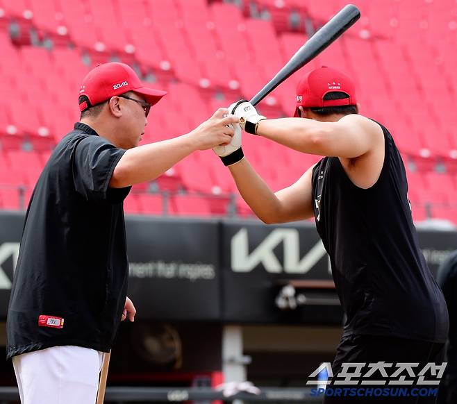 4일 롯데전을 앞두고 김석환을 집중 지도한 이범호 감독은 "중심을 앞발로 이동한 뒤 머리부터 골반까지 축을 고정한 상태에서 타이밍을 잡아야 하고, 팔이 아닌 골반과 어깨를 돌려 배트의 궤적이 흔들림 없이 돌아 나오게 만들어야 한다"(영상 참조)고 반복해서 강조했다.