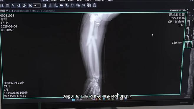영상에서 담당 의사는 "전완부 골절이 있었따. 움직임이 많아 6주간 통깁스를 유지했다. 이제는 반깁스로 전환하지만,완전한 회복까지는 3개월 정도 더 주의가 필요하다"고 설명했다.