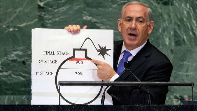 ▲ 유엔총회에서 이란이 추진해 온 핵프로그램의 위험성을 강조하는 베냐민 네타냐후 이스라엘 총리