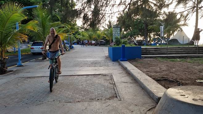 "다행이군. 이곳이 바로 내가 말한 그 서핑 스폿이야. 파도가 제일 좋은 시기는 12월부터 2월 사이지만 그 외의 계절에도 이렇게 자전거를 즐기고 때로는 야간 서핑도 즐긴다."