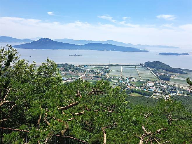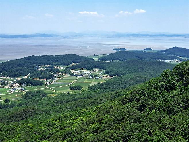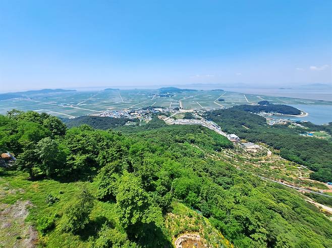 | ▲ 교동 평야 화개산 전망대에서 바라 본 교동 평야. 섬과 섬 사이 갯벌을 메워 펼쳐진 너른 평야가 무척 포실해 보인다. |