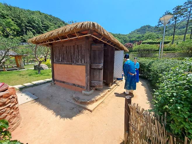 | ▲ 연산군 유배지 위리안치 된 유배지가 충실하게 재현되었다. 탱자나무로 울타리 삼고, 무척 협소한 크기의 방과 부엌 한 칸씩이다. 화개산에 조성된 정원 안에 있다. |