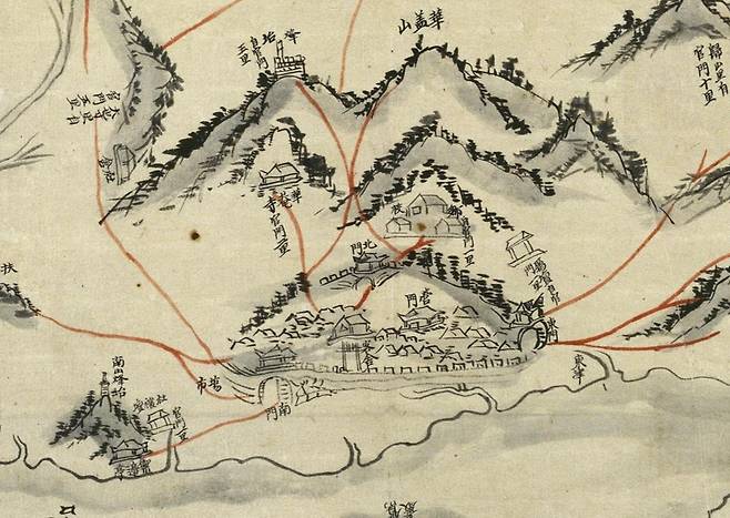 | ▲ 교동읍성(1872년지방지도_부분) 화개산과 교동향교, 그 아래로 교동읍성이 알밤처럼 토실하다. 바다에 접한 오른쪽 동문 옆으로 강화도 가는 동진(東津) 나루가, 왼쪽 아래 남문 밖으로 봉화대와 사직단을 가진 남산이 그려져 있다. |