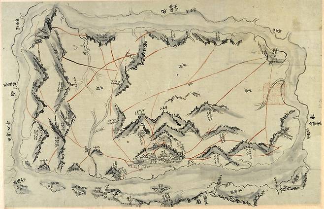 | ▲ 교동도(1872년지방지도) 조선 후기에 제작한 지도에도 '평야(平野)'라는 글자가 곳곳에 보인다. 섬과 섬 사이 갯벌을 막아 조성한 군둔전의 흔적이다. |