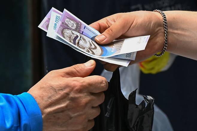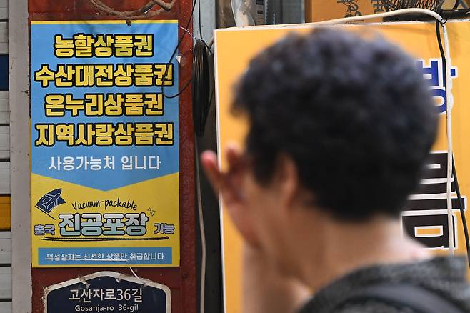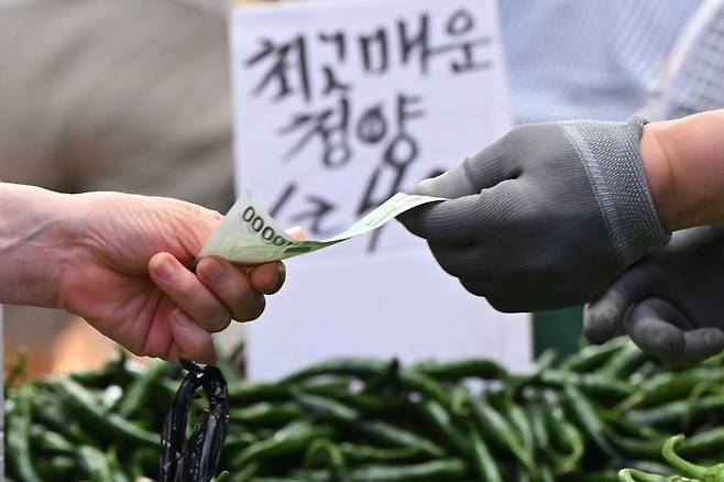 정부는 경제 회복을 위해 전 국민에게 민생회복 소비쿠폰을 1인당 15만원씩 지급하겠다고 밝혔다. 사진은 6일 동대문구 청량리농수산물시장에서 온누리상품권으로 상품을 구매하는 모습.