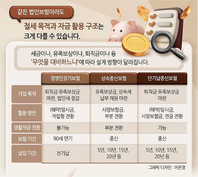 크게 ▷상속세 납부를 위한 상속종신보험 ▷법인세 절감을 노리는 경영인정기보험 ▷법인 유동성 확보용 단기납 종신보험 등으로 나뉩니다. 각각 사망보장 위주, 세금 절감, 자금 확보 등 핵심 목적이 다르기 때문에, 자신의 상황과 우선순위에 따라 맞춤형 설계가 필요합니다.