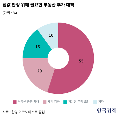 집값 안정을 위해 추가로 필요한 부동산 대책을 묻는 질문에도 경제전문가 중 55%가 '주택 공급 확대'를 꼽았다.