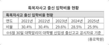 최근 5년간 신입생 현황을 살펴보면 2021학년도 30.4%였던 서연고 3개 대학 특목자사고 출신 신입생 비율이 2025학년도에는 25.9%까지 지속적으로 하락했다.