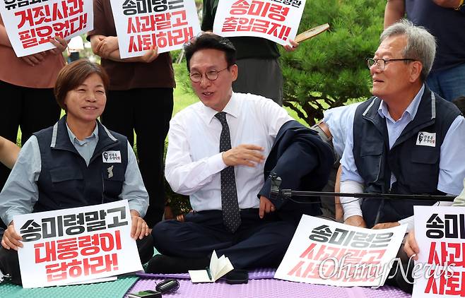 | ▲ 김민석 국무총리가 취임 후 첫 일정으로 4일 오전 서울 용산구 대통령실 앞에서 송미령 농림축산식품부 장관 유임 결정 철회를 촉구하며 항의 농성 중인 농민단체와 면담을 하고 있다. |