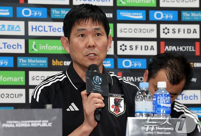 (용인=뉴스1) 이동해 기자 = 일본 모리야스 하지메 감독이 6일 오후 경기도 용인미르스타디움에서 열린 2025 동아시아축구연맹(EAFF) E-1 챔피언십 남자부 공식 기자회견에서 기자들 질의에 답하고 있다. 2025.7.6/뉴스1