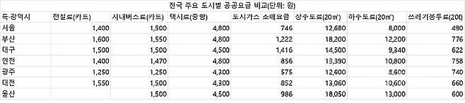 그러다보니 전국 시·도와 비교해 광주는 모든 공공요금 항목에서 전국 최저 수준을 기록 중이다. 광주시가 공공요금을 억누르고 있는 사이 대부분 시·도는 2023년과 2024년에 걸쳐 순차적으로 공공요금 현실화를 이뤄내서다.