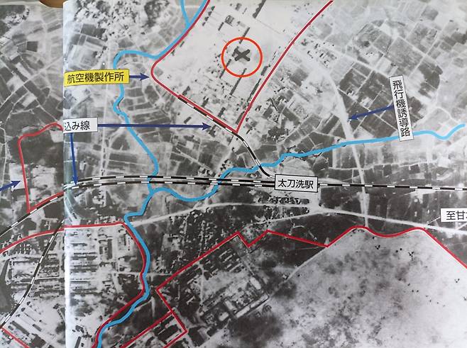 | ▲ 상단 빨간 동그라미(항공기 제작소)가 당시 미군 B-29기의 폭격 목표였다. 가운데 하얀 네모의 '다치아라이(大刀洗)역'이 보인다. 그 아래 넓은 공터가 전투기 비행장. |