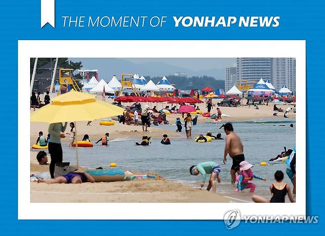 (강릉=연합뉴스) 유형재 기자 = 강원 강릉지역에 폭염경보와 7일째 열대야가 이어진 6일 경포해수욕장에서 피서객들이 무더위를 식히고 있다. 2025.7.6 [THE MOMENT OF YONHAPNEWS]