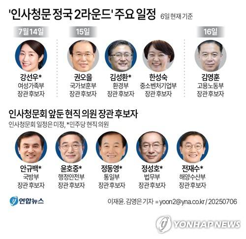 소관 상임위별로 확정된 인사청문회 일정은 6일 기준으로 14일 강선우 여성가족부 장관 후보자, 15일 권오을 국가보훈부·김성환 환경부·한성숙 중소벤처기업부 장관 후보자, 16일 김영훈 고용노동부 장관 후보자 등이다.