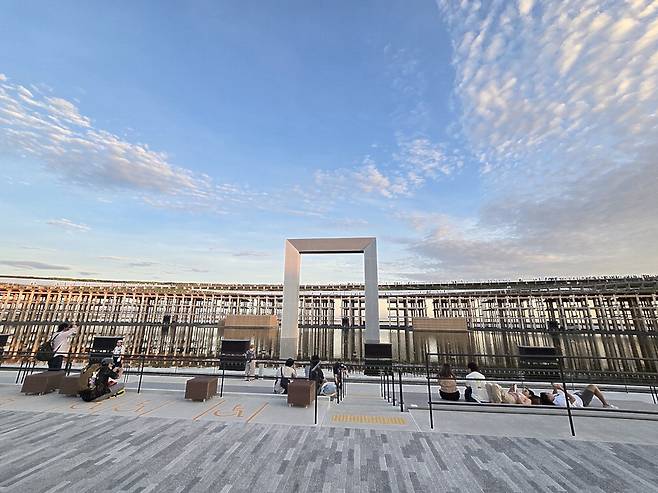 엑스포 현장에서 관람객의 시선을 사로잡는 건축물은 바로 그랜드 링이다. 지름 615m, 둘레 2㎞에 이르는 그랜드 링은 현존하는 세계 최대 목조건축물이다. 기네스북에도 올라 그 위용을 뽐낸다. 그랜드 링은 단순한 조형물을 넘어 엑스포의 길잡이 역할도 한다. 링을 따라 158개국 국가관·기업관·도시관 등이 길게 이어져 관람 동선의 중심축을 이룬다. 뜨거운 열기가 최고조에 이르는 한낮에는 관람객에게 시원한 그늘이 되기도 한다. 그랜드 링은 일본의 전통 목조건축 기술인 관 접합 방식을 현대 공법과 결합해 완성됐다. 일본산 삼나무와 편백나무, 유럽산 적송나무 등이 활용됐는데 금속 없이 나무만으로 지은 구조물에 놀라지 않을 수 없다. 에스컬레이터를 타고 그랜드 링 지붕 데크에 오르면 엑스포 전경이 한눈에 들어온다. 특히 해 질 녘 서쪽 하늘을 붉게 물들이는 석양이 장관을 이룬다.