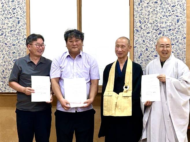 | ▲ 일본 관음사는 주말인 6일, 다나카 세코 전 관음사 주지가 부석사를 방문해 불상의 3D 스캔 파일과 복제동의서를 전달했다. (사진 왼쪽부터 불상 제자리봉안위 이상근 대표, 충남역사문화연구원 이현상 교류협력부장, 다나카 세코 전 관음사 주지, 부석사 주지 원우 스님) |