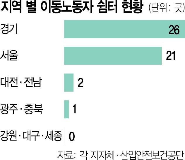 6일 서울경제신문 취재를 종합하면 전국 91개 이동노동자 쉼터 중 절반 이상인 47개가 서울·경기에 집중된 것으로 나타났다. 강원·대구·세종에는 현재 마련된 쉼터가 한 곳도 없다. 충북·광주에는 1곳, 대전·전남에는 2곳이 전부다. 강원도청 측은 “각 시에서 수요가 없다보니 그동안 설치하지 않았다”고 설명했다. 대구는 기존에 운영하던 쉼터 2곳이 최근 문을 닫고 다른 구에서 이달 말 개소를 준비 중이다.