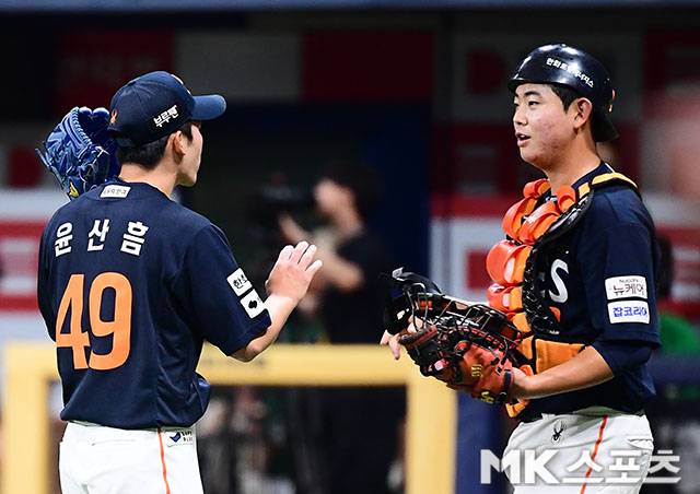 한화 윤산흠이 승리를 마무리 짓고 허인서 포수와 기쁨을 나누고 있다.