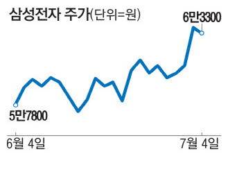 삼성전자 투자자들 사이에선 최근 상승 랠리를 펼치고 있는 주가가 다시 하락세로 접어들지 않을까 하는 우려도 나온다. 상반기에 줄곧 5만원대를 벗어나지 못하던 삼성전자 주가는 지난달 말 6만원 선에 진입해 이달 4일 장중 6만4700원까지 오른 바 있다.