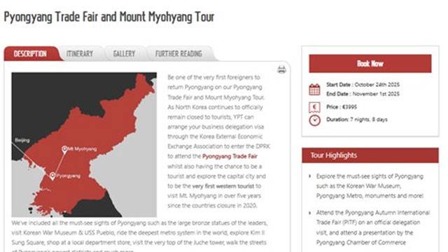 중국에 본사를 둔 북한 관광 전문업체 '영파이어니어 투어스'(Young Pioneer Tours)는 홈페이지를 통해 오는 10월 24일부터 11월 1일까지 7박 8일 일정으로 평양에 방문할 관광객을 모집한다고 공지했습니다.
