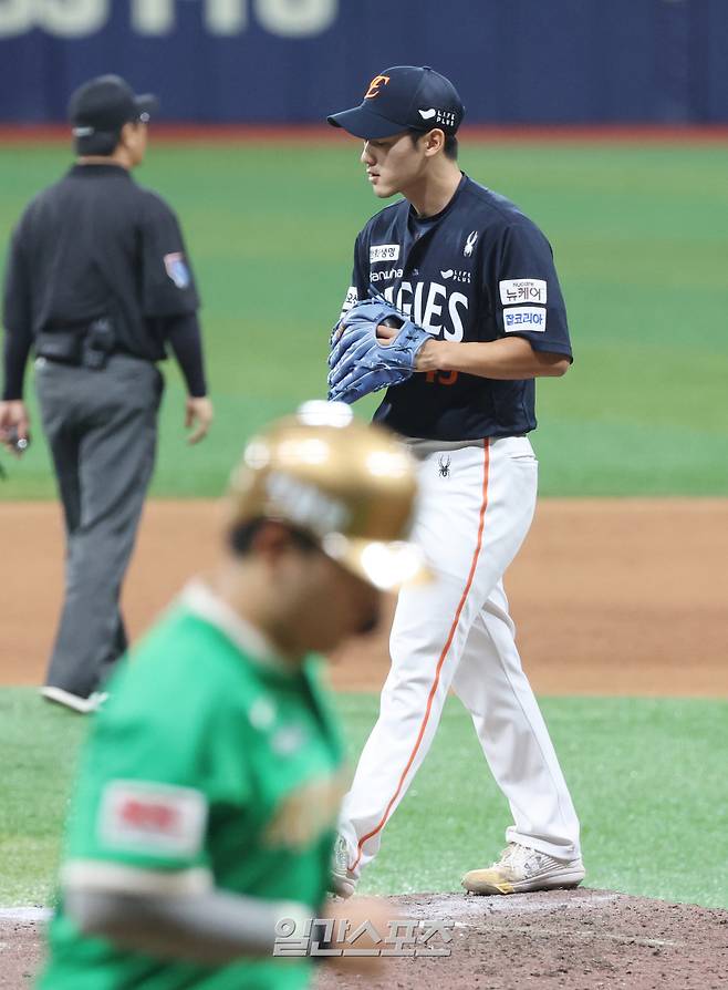 6일 오후 서울 고척스카이돔에서 열린 2025 KBO리그 프로야구 키움히어로즈와 한화이글스의 경기에서 9회말 2사 1,3루 서유신 타석 때 투수 윤산흠이 보크를 범해 실점하고 있다.