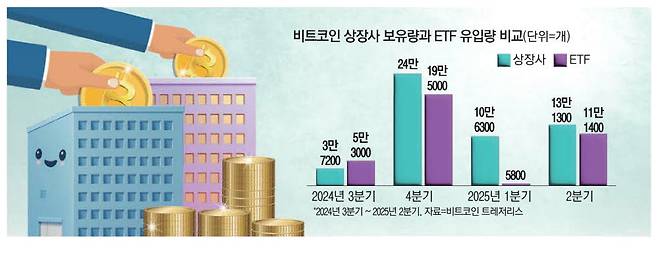 비트코인시장에서 상장사들의 매수세가 3분기 연속 상장지수펀드(ETF)를 앞지르고 있다.