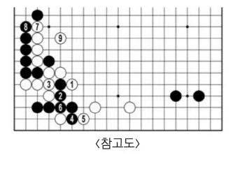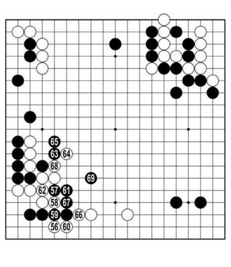 백56으로 공격을 알렸다. 흑57로 신경을 건드렸다. 한번 마음먹은 생각을 좀처럼 바꾸지 않는 변상일은 백60으로 넘고 계속 공격을 외쳤다. 인공지능 카타고는 <참고도> 백1로 막아 흑이 귀에서 살게 하는 게 낫다고 한다. 사람 같은 감정 없이 이길 확률 같은 계산을 앞세우는 기계가 할 수 있는 판단이다.