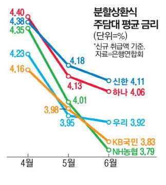 6일 전국은행연합회에 따르면 NH농협은행이 지난달 신규 취급한 분할상환식 주담대 평균 금리는 연 3.79%였다. 전월 연 4.01%에서 0.22%포인트 떨어지며 연 3%대에 들어선 것이다. 같은 기간 SC제일은행이 신규 취급한 주담대 연 금리도 4.02%에서 3.88%로 내렸다. 이 밖에 KB국민은행 3.83%, 우리은행 3.92%, IBK기업은행 3.98%로 상당수가 3%대로 들어왔다.