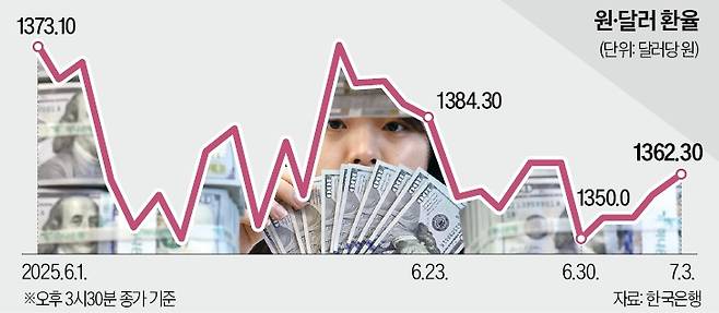 지난주 원·달러 환율은 반기 말 수출업체의 달러 매도 영향으로 잠시 1350원 아래로 떨어졌다가 주 후반 1360원대로 올라섰다. 미국 고용지표가 예상보다 좋게 나오자 미국 중앙은행(Fed)이 이달 기준금리를 내릴 가능성이 낮아지면서 달러가 강세를 보였기 때문이다.