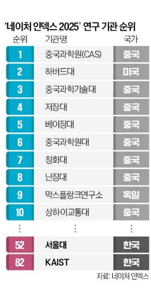 6일 자연과학 분야 연구성과 평가 지표인 ‘네이처 인덱스 2025’에 따르면 중국은 국가별 종합 순위에서 미국을 제치고 2년 연속 세계 1위를 차지했다. 상위 10개 연구기관 가운데 8곳이 중국 대학과 연구소였다. 한국은 서울대(52위)와 KAIST(82위)만이 100위 안에 이름을 올리는 데 그쳤다.