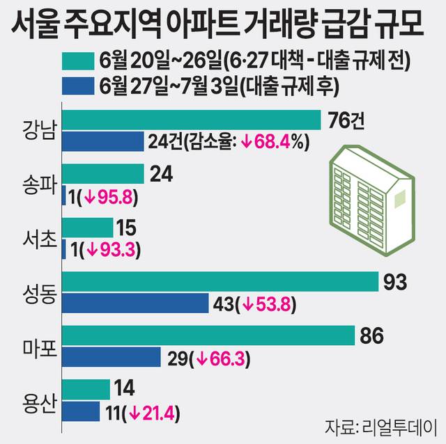 김제경 투미부동산컨설팅 대표는 “6·27 대출규제로 주택 매수가 어려워진 데다, 가격 조정을 기대한 매수자들이 거래 결정을 보류하기 시작하면서 당분간 부동산 거래 소강 상태가 지속될 것으로 예상한다”고 말했다.