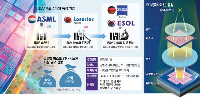 6일 관련업계에 따르면 극자외선(EUV) 노광 공정은 반도체의 미세화를 가능하게 만든 일등 공신이자 세계 반도체 장비 생태계에서 가장 높은 진입장벽을 자랑하는 영역이다. ‘슈퍼을’로 불리는 네덜란드의 ASML이 웨이퍼에 회로를 그리는 EUV 노광기를 독점하고 일본 레이저텍(Lasertec)이 마스크 결함 검사기를, 독일 칼자이스(Carl Zeiss)가 투영광학계 등 광학시스템을 각각 독점하며 강력한 생태계를 구축하고 있다.
