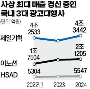 6일 광고업계에 따르면 제일기획은 지난해 매출(4조3442억원), 영업이익(3207억원) 모두 사상 최고 기록을 새로 썼다. 올해도 최대치 경신이 유력하다. 2위 이노션과 3위 HSAD도 마찬가지다. 현대차증권은 최근 보고서에서 이노션의 매출 총이익이 올해 처음 1조원을 넘겨 1조41억원에 이를 것으로 예상했다. HSAD도 지난해 매출 5500억원을 처음 넘어서는 등 성장세가 꺾이지 않고 있다.