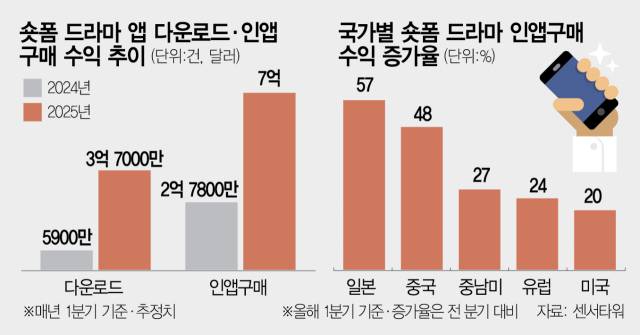 특히 전 세계적으로 숏폼이 주요 콘텐츠 소비 성향으로 자리잡으며 콘텐츠 기업들은 더 이상 숏폼을 무시할 수 없게 됐다. 숏폼은 게임·웹툰 등 다른 장르의 콘텐츠 소비까지 흔들고 있는 상황이다. 글로벌 통계 조사 기관인 스태티스타에 따르면 지난해 400억 달러(약 54조 원)를 기록한 글로벌 숏폼 시장은 향후 5년 간 연평균 60%의 성장률을 보일 전망이다. 이에 숏폼 중에서도 주목받고 있는 숏폼 드라마 시장도 덩달아 커지는 모습이다. 센서타워에 따르면 올해 1분기 전 세계 숏폼 드라마 앱의 인앱결제 수익은 7억 달러(약 9559억 원)로, 전년 동기 대비 3배 늘었다. 다운로드 수도 가파르게 증가하면서 올 1분기 3억 7000만 건을 돌파했다.