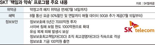 SK텔레콤은 지난 4일 보상안을 발표하면서 책임(위약금 면제)과 집토끼 잡기(매월 연말까지 데이터 50GB 제공) 전략을 모두 적용했다. 위약금 면제 대상은 해킹 사고가 발생한 지난 4월 18일 24시 기준 약정 고객 중 이미 해지했거나 오는 14일까지 해지 예정인 고객이다. 15일부터는 SK텔레콤 알뜰폰을 포함한 고객 2400만명에게 5000억원 규모의 고객감사패키지 혜택을 제공한다. 8월 통신요금 50% 할인 및 연말까지 매월 데이터 50기가바이트(GB)를 별도 신청 없이 자동 제공한다. 정보유출 사태 후 해지 고객이 해지일로부터 6개월 내 재가입 할 경우에는 가입 연수, 멤버십 등급을 원상복구해 제공한다. 다만 위약금 면제 등으로 인한 재무 부담은 쉽지 않은 상황이다.