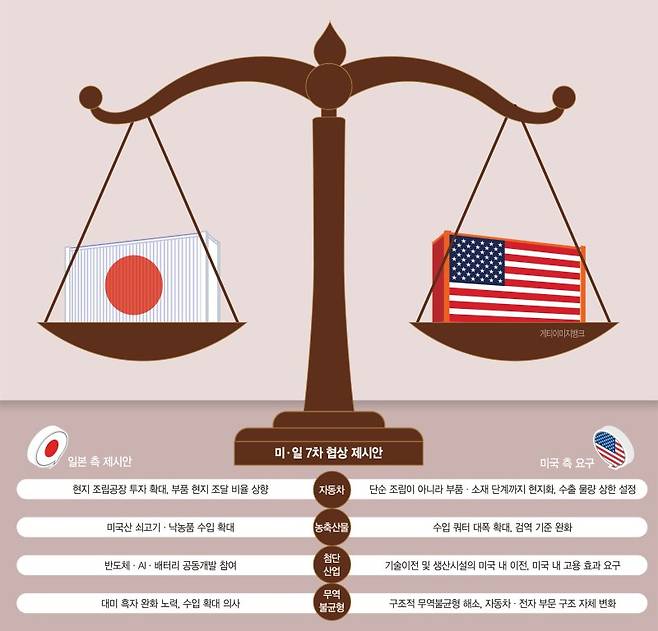 7차까지의 협상에서 일본은 농산물·식품류 수입 확대와 함께, 자동차 부품 공장을 미 현지에 증설하겠다는 방안도 제시했지만 미측은 "고용 창출 효과가 불충분하다"며 만족하지 못한 것으로 전해졌다. 일부 일본 관료들은 "트럼프 대통령이 내세운 관세 압박 전략이 사실상 일본의 공급망 구조 자체를 뜯어고치려는 의도"라고 보고 있다. 실제로 자동차뿐 아니라 전자·반도체·화학 소재 등 전략 산업 전반에 미국 측이 교차적으로 상한선이나 현지생산 의무를 부과할 수 있다는 시나리오도 거론된다.