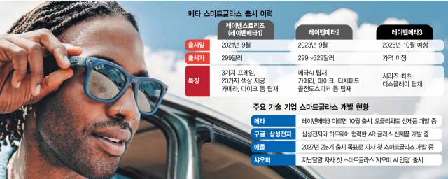스피커와 카메라만 달렸던 메타 스마트글라스가 증강현실(AR) 글라스로 업그레이드돼 이르면 10월 출시된다. 생성형 인공지능(AI)과의 궁합으로 주가가 높아진 스마트글라스에 최초로 디스플레이까지 탑재되면서 AR 디바이스 대중화의 마중물이 될 수 있다는 분석이 나온다. 10년 전 AR 시장에서 쓴맛을 봤던 구글도 삼성전자(005930)와 차세대 AR 글라스를 개발하고 있고 애플도 2027년을 목표로 첫 애플글라스를 내놓을 예정이어서 AR 시장이 이번에는 열릴 수 있다는 기대감이 커지고 있다.