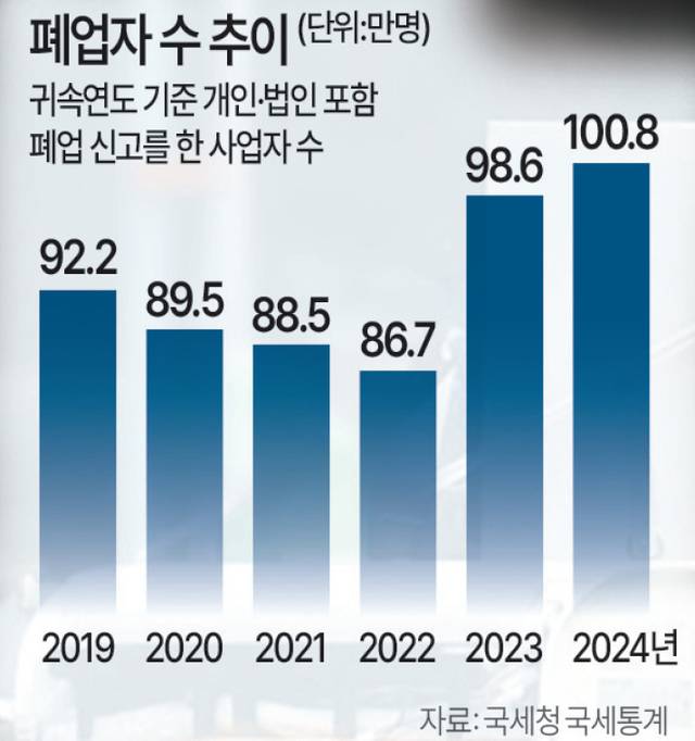 지난해 폐업한 소상공인이 처음 100만명을 넘어선 것으로 나타났다. 폐업 업종은 소매업·음식점업이 가장 많았고, 개인에 이어 법인 사업자 등으로 확산되는 모습이다. 장기화된 경기 침체에 미국발 관세 등 대내외적 불확실성이 민생 경제에 악영향을 끼쳤다는 분석이다.