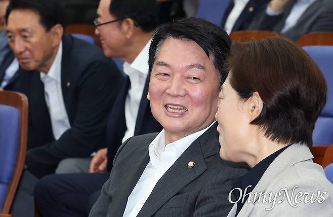 | ▲ 국민의힘 혁신위원장에 임명된 안철수 의원이 4일 서울 여의도 국회에서 열린 의원총회에서 서지영 의원과 대화하고 있다. |